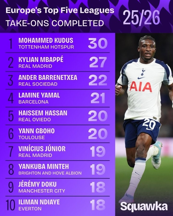 谁最能过东谈主?五大联赛过东谈主榜:库杜斯30交替1!姆巴佩2亚马尔4