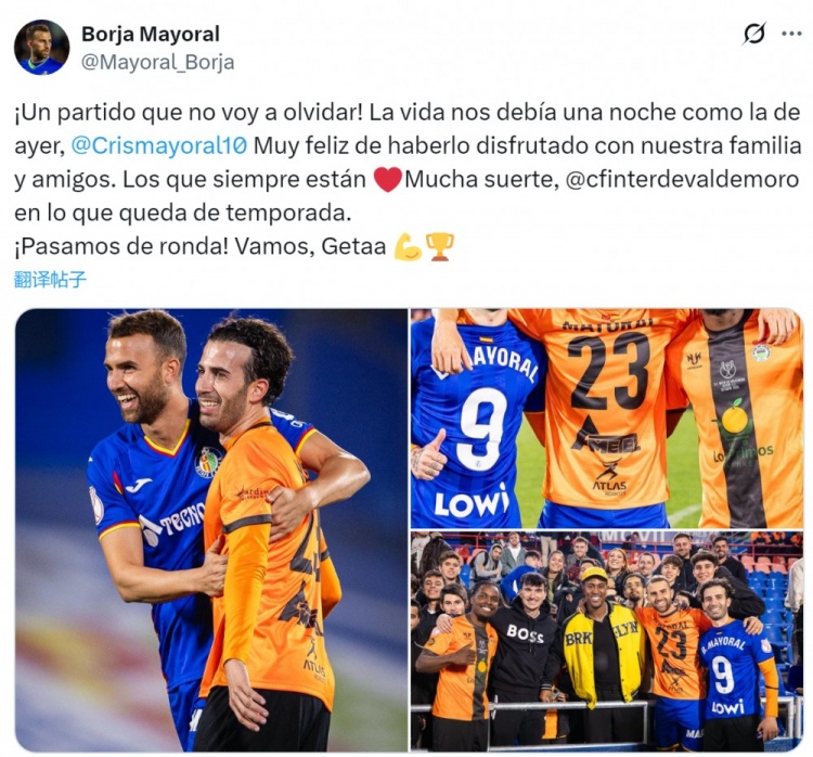 10月30日讯 赫塔费时尚马约拉尔更新社媒动态,晒出与哥哥同场竞技的相片。