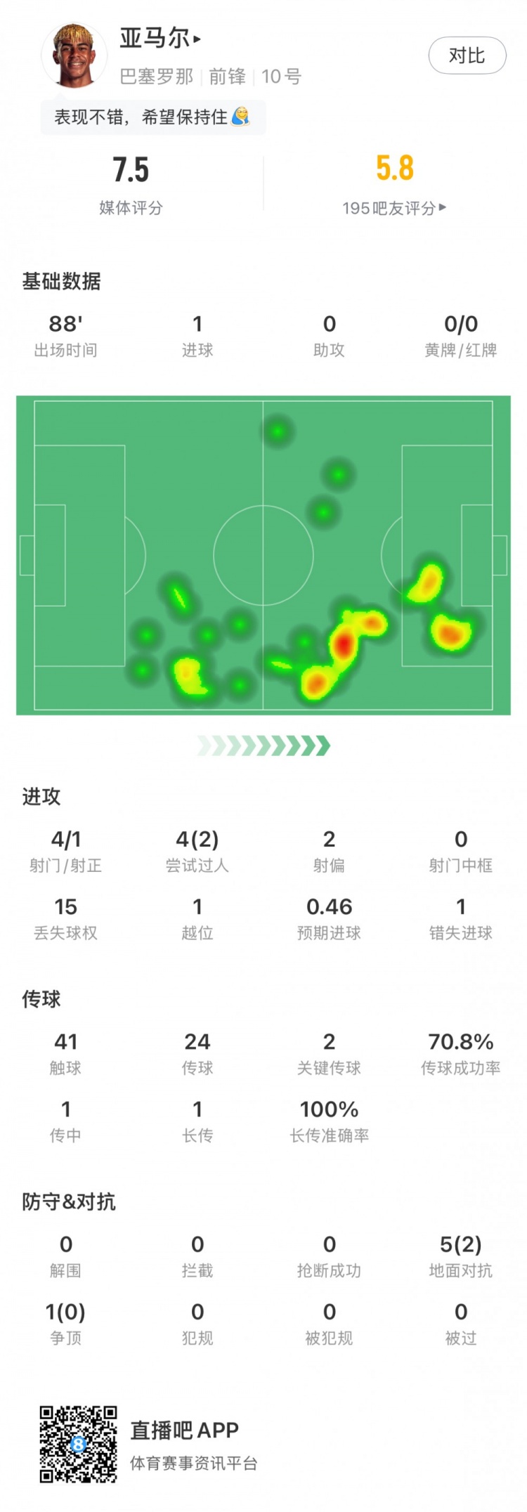 亚马尔数据:4射1正1进球,2关节传球,预期进球0.46,评分7.5
