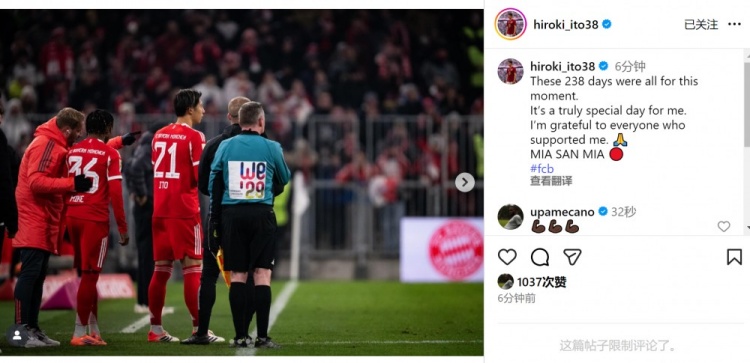 伊藤洋辉赛后在应付媒体上写说念:“这238天,皆是为了这一刻。 对我来说这简直是一个至极的日子。 感谢所有救助过我的东说念主🙏MIA SAN MIA🔴”