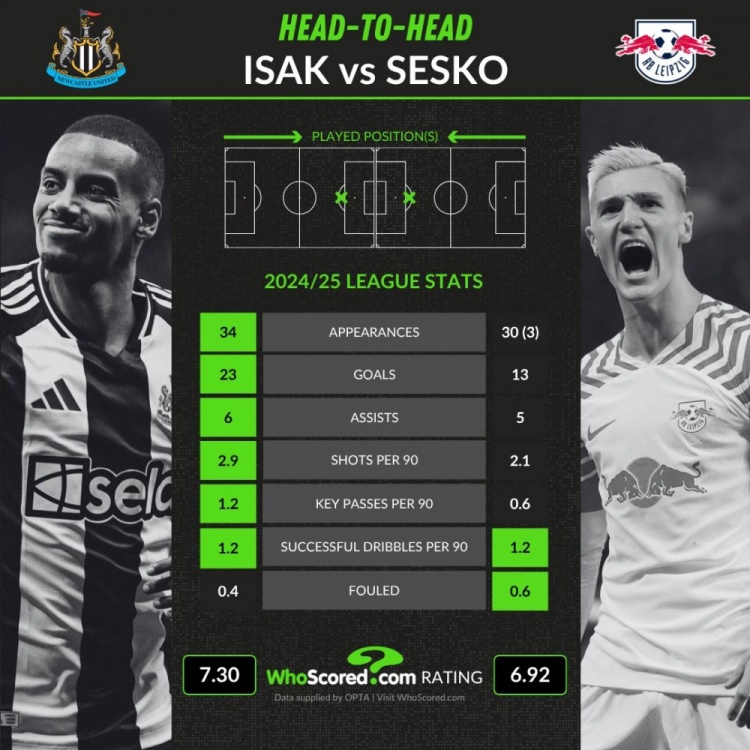7月30日讯 在迪亚斯官宣加盟拜仁后,伊萨克、塞斯科的潜在连锁转会也正在进行中。whoscored也对比了两东说念主的上赛季联赛枢纽数据: