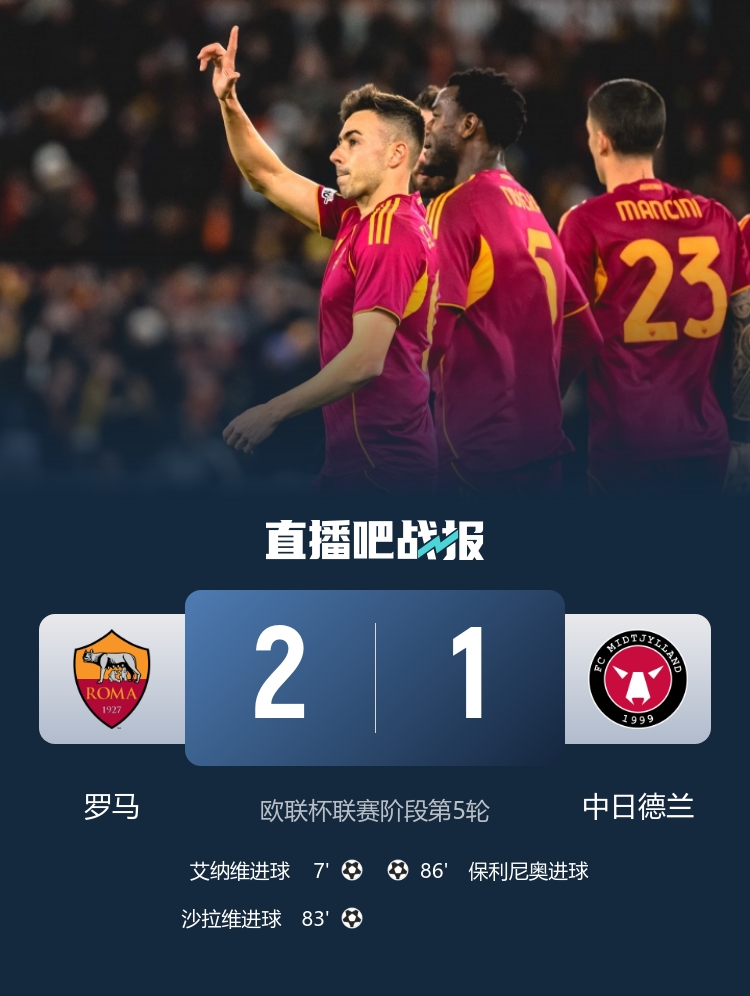 11月28日讯 罗马在欧联杯2-1打败中日德兰,再次获得了1球小胜。