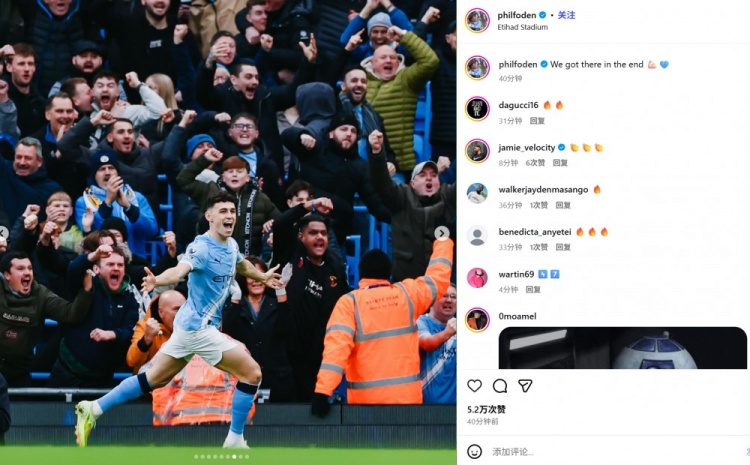 双响闪击+绝杀!福登社媒晒庆祝照:咱们最终依然赢了!