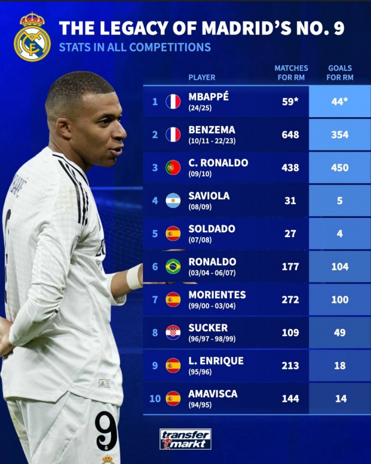 注:出场指皇马生计总计比赛,并非身穿9号的出场次数