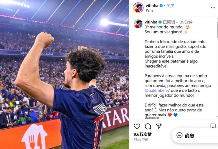 9月24日讯 在赢得金球奖第三名后,巴黎中场维蒂尼亚更新了外交媒体。