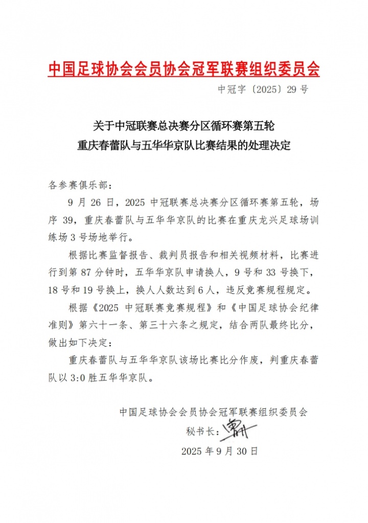 09月30日讯 中冠决赛阶段分组赛第5轮,重庆春蕾1-3不敌五华华京。中国足球协会会员协会冠军联赛组织委员会发布公告,由于五华华京队换东说念主东说念主数达到六东说念主,违背竞赛规程规章,该场比赛五华华京被判0-3负。