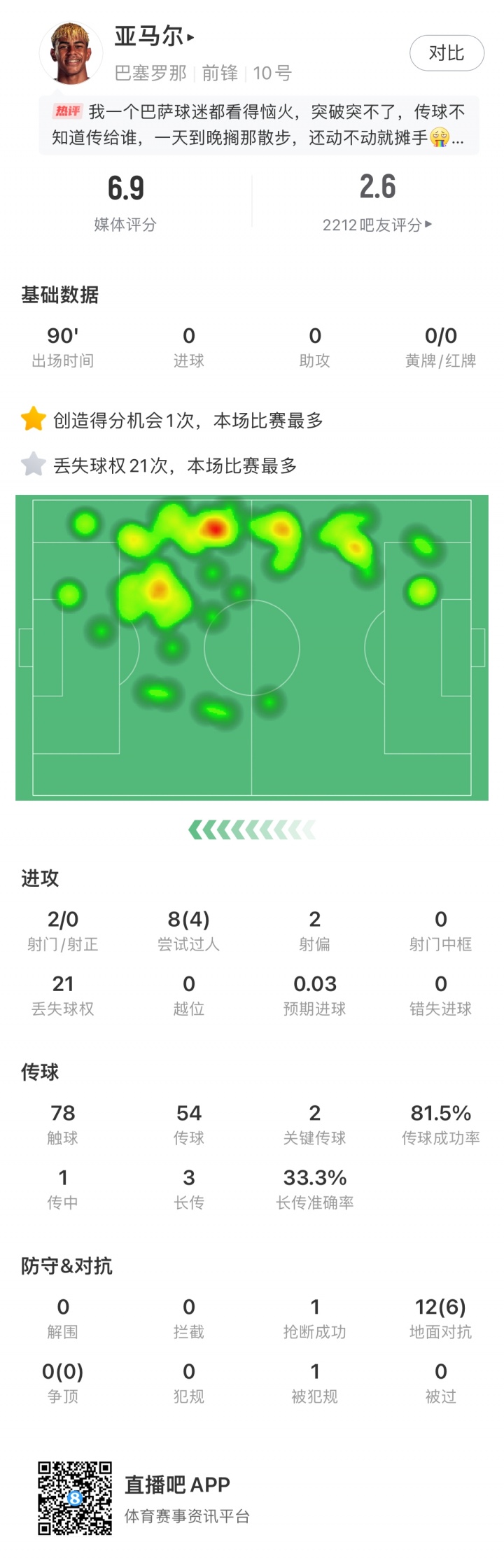 10月27日讯 本赛季首场西班牙国度德比皇马驯顺巴萨,本场比赛巴萨小将亚马尔樗栎庸材,这与赛前他的高调造成反差!亚马尔本场2射0正+2要津传球 8过东谈主4顺利+21丢失球权获评6.9分!