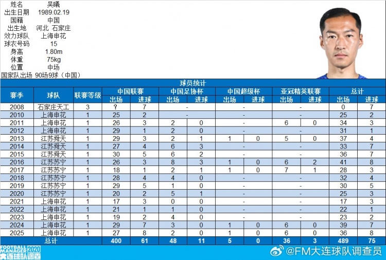 11月1日讯 据博主“FM大连球队探望员”统计,吴曦照旧兑现了中国顶级联赛出场400场里程碑。