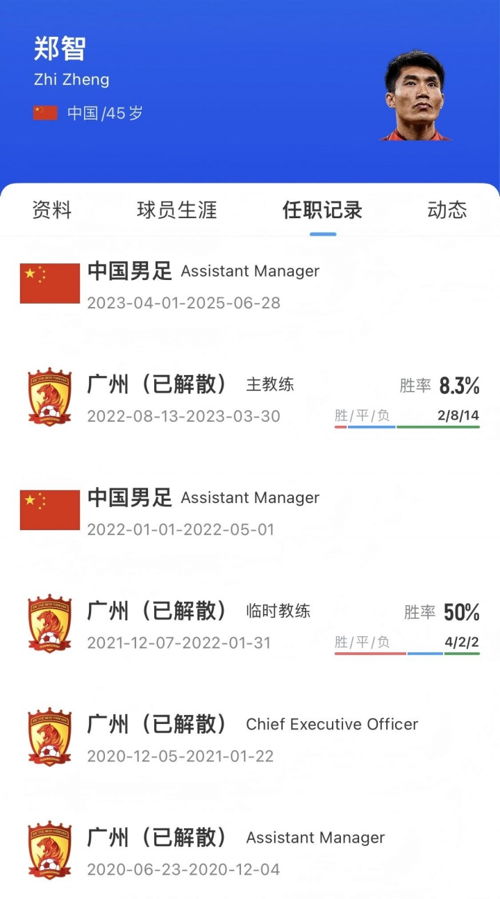 2002年12月,国足3-1打败叙利亚,22岁3个月17天的郑智献技了他在国足的首秀。2019年1月,亚洲杯1/4决赛,国足0-3不敌伊朗,38岁的郑智打满全场,完成了在国度队的终末一次出场。2022年1月,41岁的郑智出战广州队vs长春亚泰的中超比赛,这是他办事生计终末一次出场。