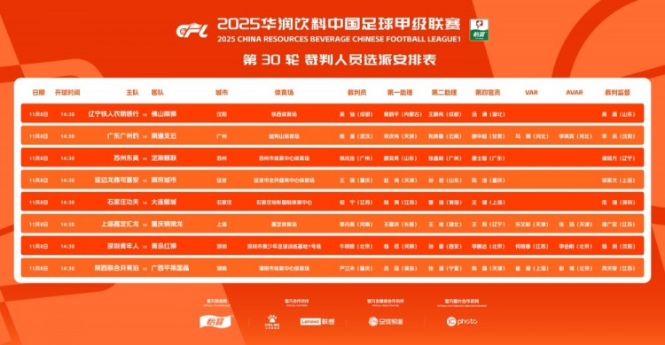 中甲第30轮裁判具体安排如下(笃定见图):