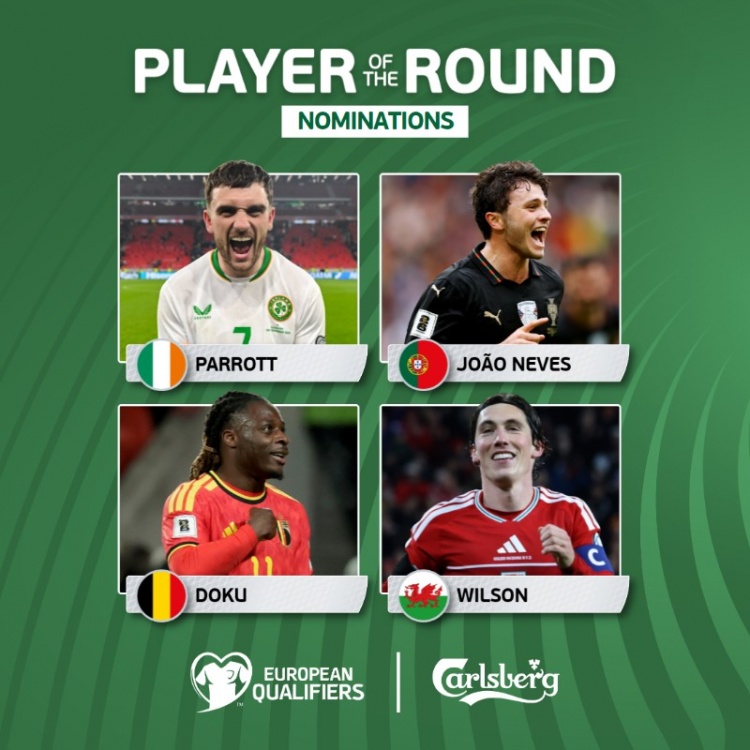 欧洲世初赛本轮最好球员候选:帕洛特、内维斯、多库、威尔逊在列