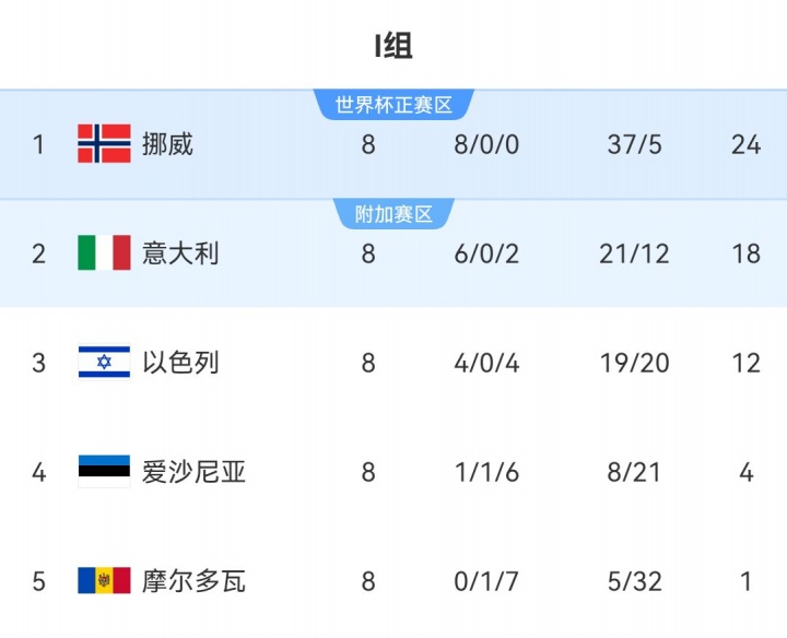 I组:挪威头名纵贯正赛,意大利第2将参加附加赛
