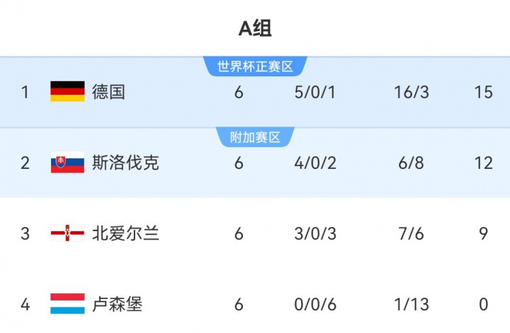 A组:德国头名纵贯正赛,斯洛伐克第2将参加附加赛,北爱尔兰凭借欧国联收成参加附加赛