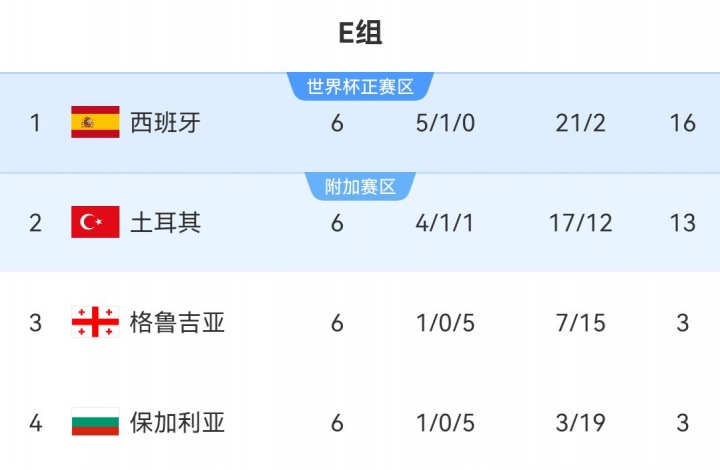 E组:西班牙头名纵贯正赛,土耳其第2将参加附加赛