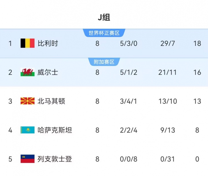 J组:比利时头名纵贯正赛,威尔士第2将参加附加赛,北马其顿凭借欧国联收成参加附加赛