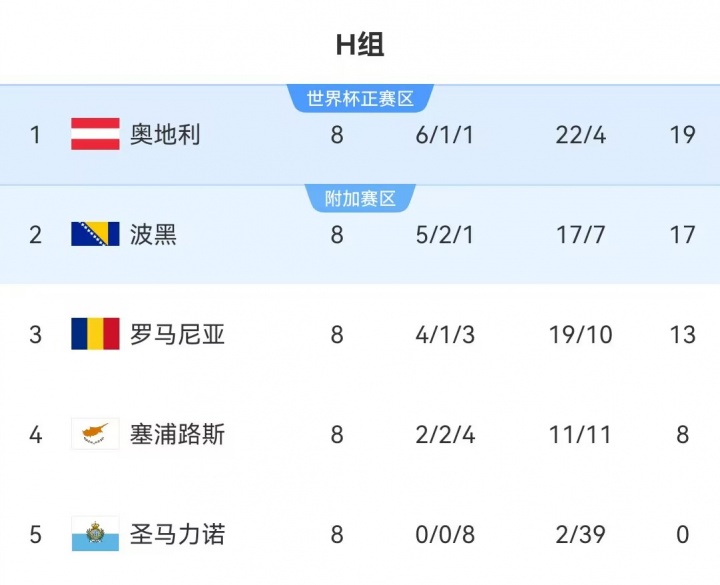 H组:奥地利头名纵贯正赛,波黑第2将参加附加赛,罗马尼亚凭借欧国联收成参加附加赛