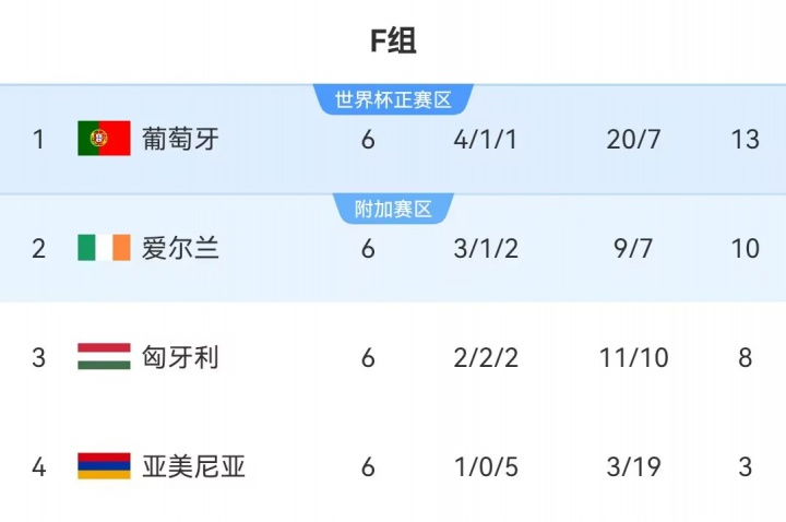F组:葡萄牙头名纵贯正赛,爱尔兰第2将参加附加赛