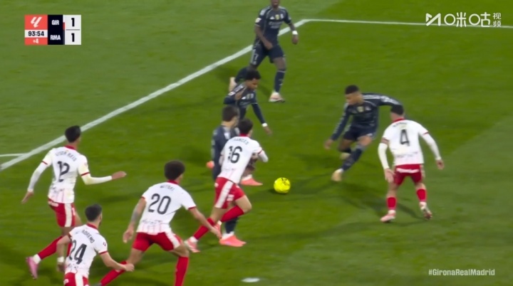 西甲第14轮,皇马客场1-1战平赫罗纳,读秒阶段皇马得到绝杀契机,贝林厄姆禁区横敲,正对球门的罗德里戈变调步点准备射门,这时正对来球但侧对球门的姆巴佩中途杀出,回身兜射打偏。