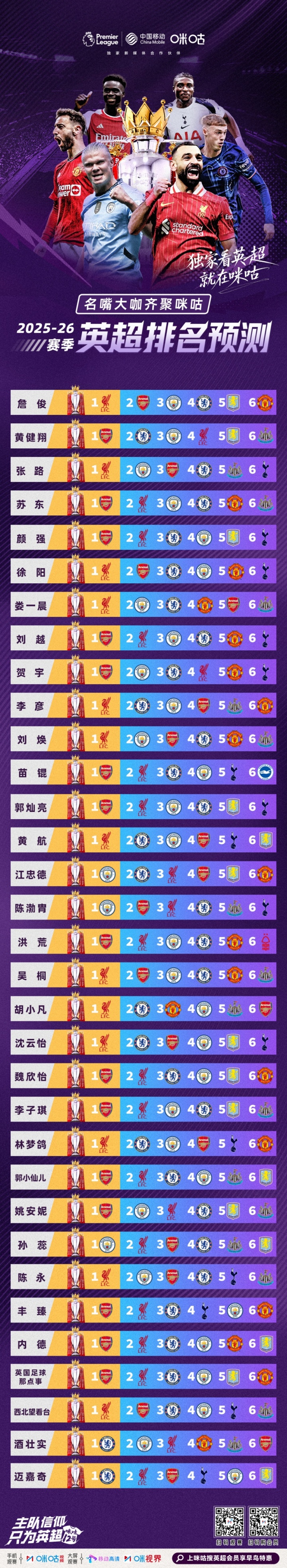 【英超开赛】咪咕独家发布超30位嘉宾排名预测,你看好谁?