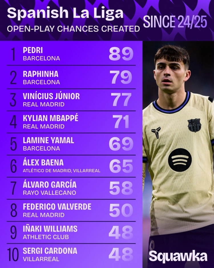西甲运动战创造机会次数排行:佩德里、拉菲尼亚前2 维尼修斯第3