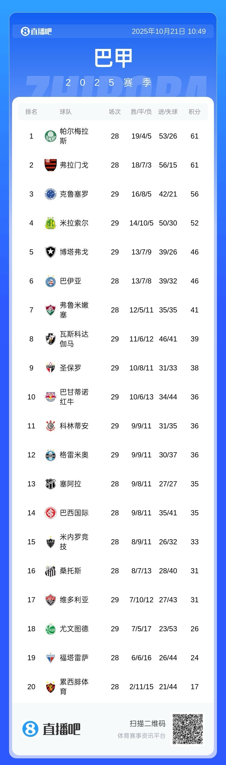 目前在积分榜上,桑托斯少赛一场28战31分位列第16位,维多利亚凭借这场胜利积分也来到31分排在第17位,根据巴甲规则,联赛最后四位直接降级。