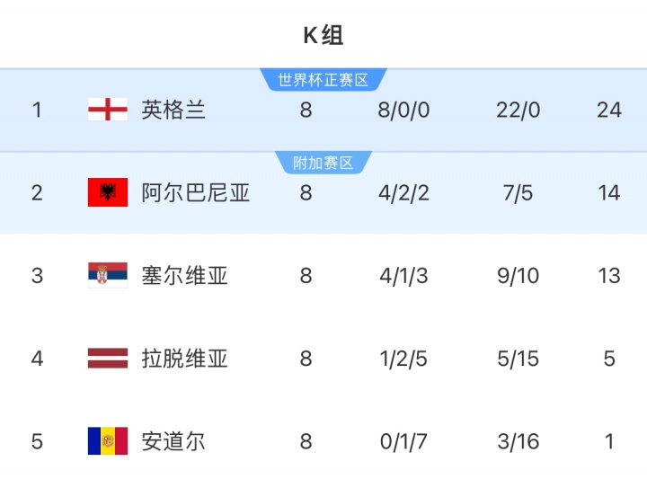 11月17日讯 英格兰2-0战胜阿尔巴尼亚后,世预赛欧洲区K组8轮比赛全部结束,阿尔巴尼亚小组第二获得附加赛资格。