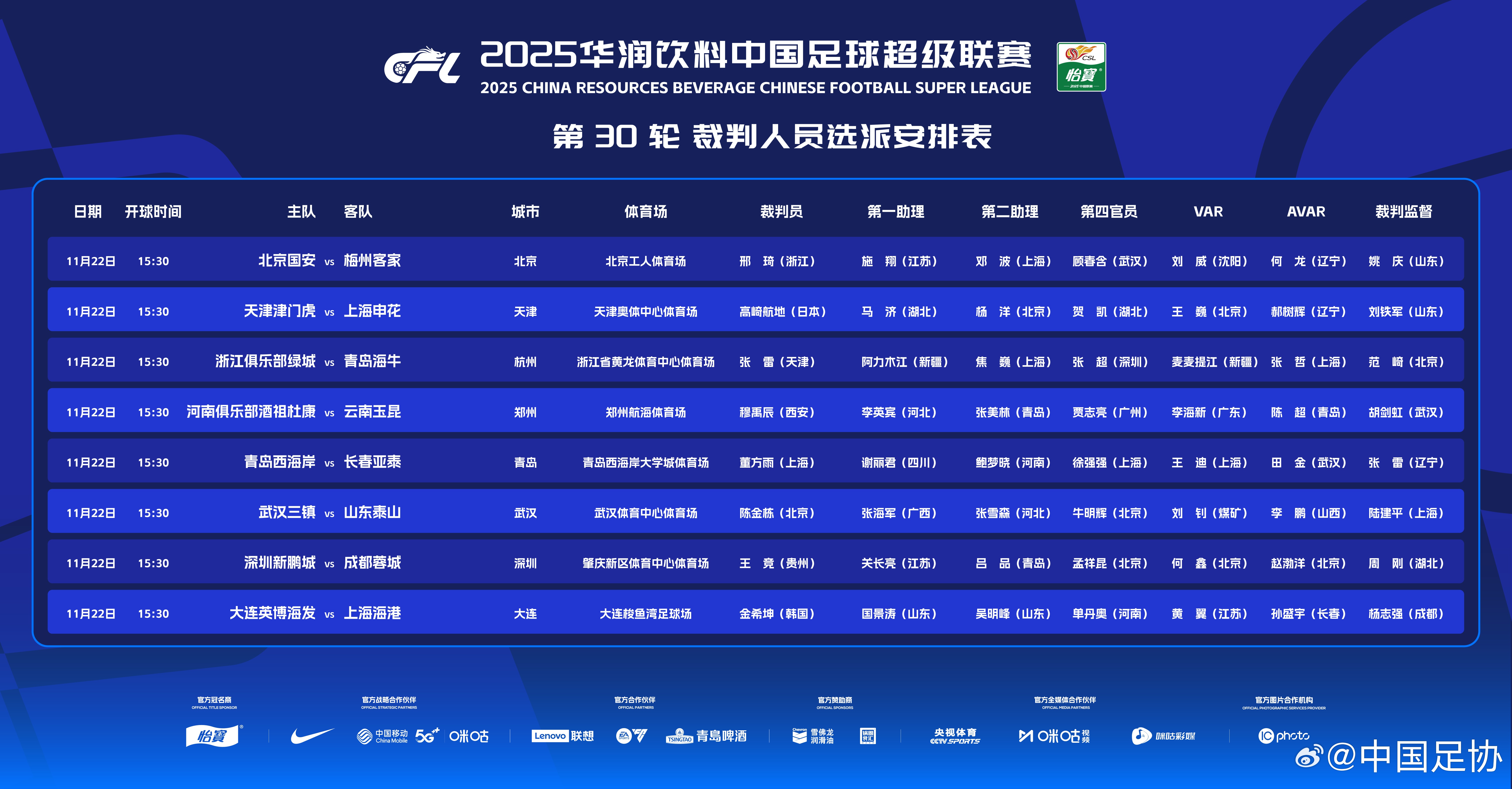 中超第30轮裁判安排↓