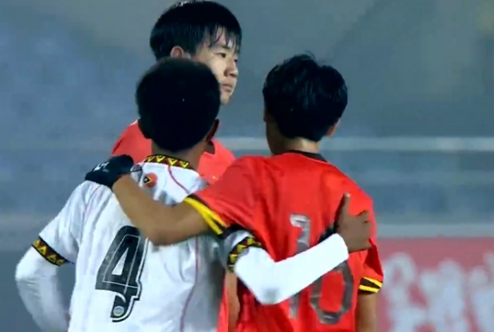 场下还是非常友好!U16国足球员主动上前安慰,将对手拉起