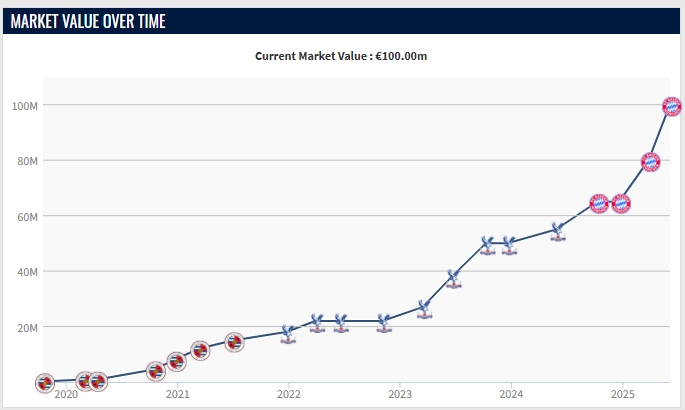 旧年夏窗,拜仁破耗5300万欧从水晶宫签下奥利塞,其时奥利塞身价5500万欧。