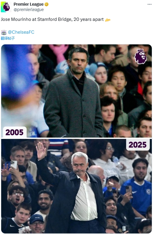 英超官推晒本菲卡主帅穆里尼奥:斯坦福桥的若泽-穆里尼奥,20年曩昔了……