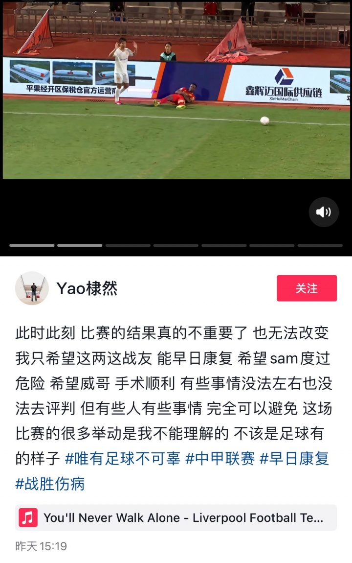 广西平果球员姚棣然在社媒写说念,“此时此刻,比赛的恶真是的不高大了,也无法转换。我只但愿这两这战友,能早日康复,但愿sam(阿萨莫阿)渡过危急,但愿威哥(黄威)手术告成。有些事情没法驾御也没法去评判,但有些东说念主有些事情,王人备不错幸免。这场比赛的好多举动是我弗成领路的,不该是足球有的神色”。