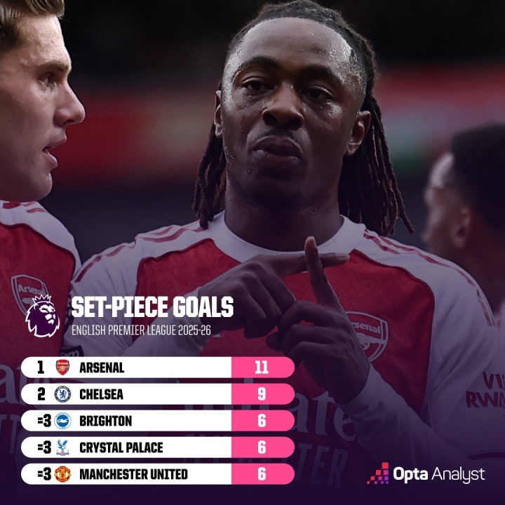 据opta数据统计,本赛季阿森纳已通过定位球打入11粒进球,位列英超第1。