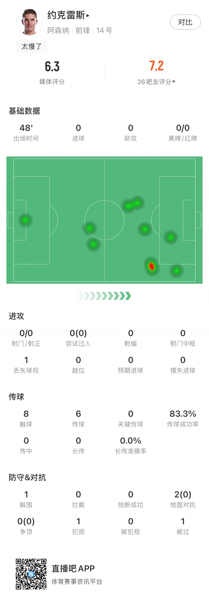 疲于肉搏!约克雷斯半场仅8次触球,0射门0过东说念主0关节传球