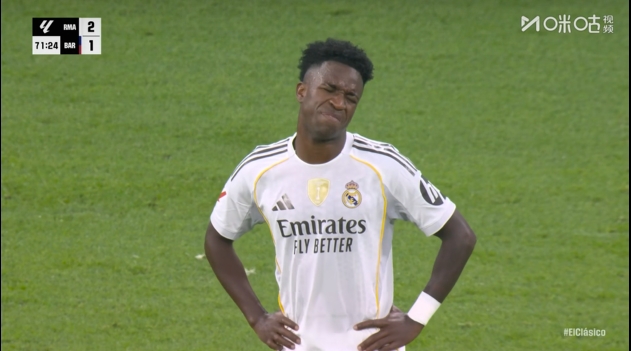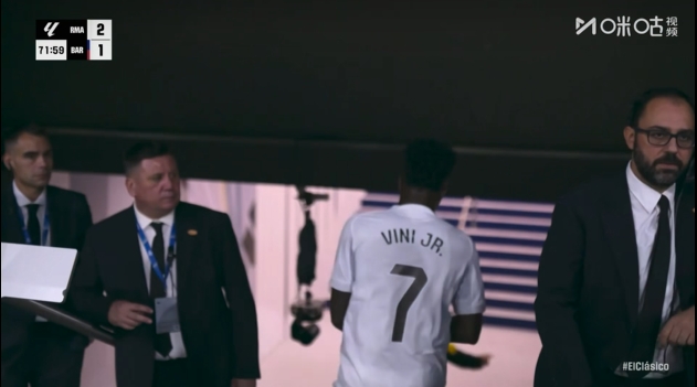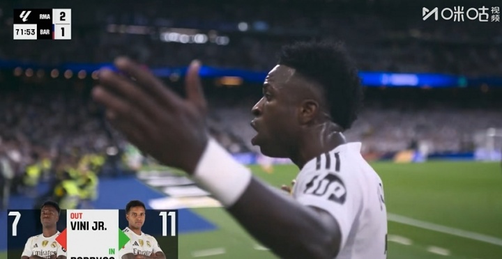10月27日讯 西甲第10轮西班牙国度德比,皇马主场迎战巴萨,第72分钟,维尼修斯被换下,沿途喋喋不时,下场胜利回更衣室。皇马换上罗德里戈。