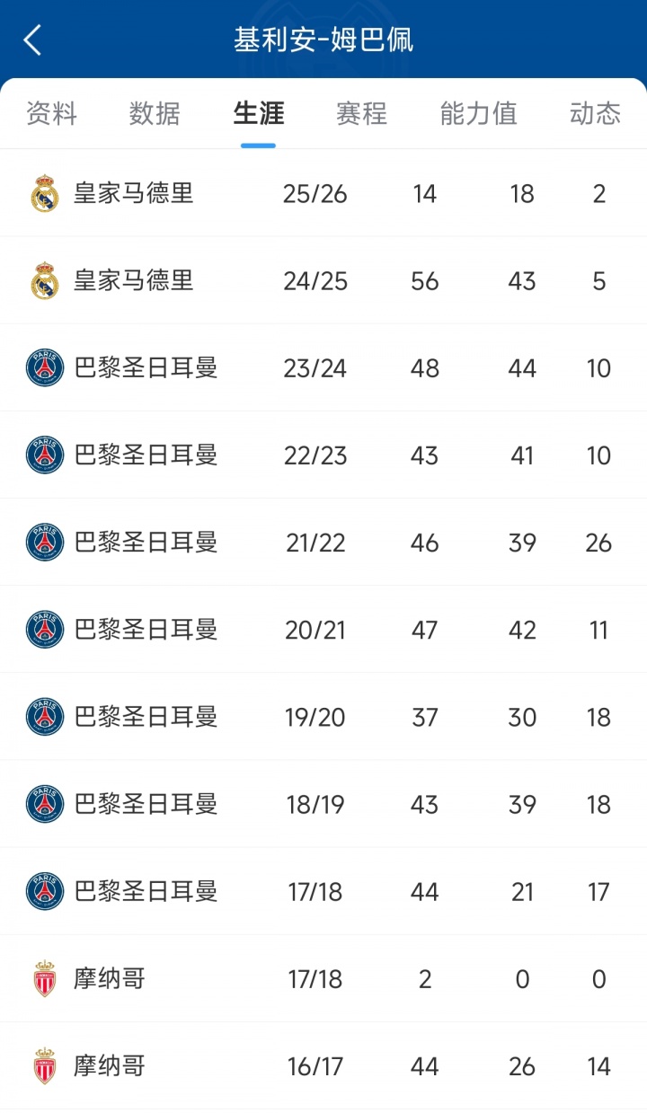 本赛季姆巴佩14场比赛还是攻入18球,状况好得离谱。姆巴佩15/16赛季17岁时入选一线队,16/17赛季在摩纳哥成名。自那以后他单赛季的进球数最少皆有21球(17/18赛季19岁),自18/19赛季以来是30+,自22/23赛季以来是40+。而本赛季,开赛仅两个半月,姆巴佩还是18球。
