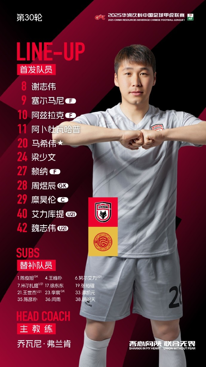 中甲第30轮对阵广西平果,陕西衔尾首发出炉!