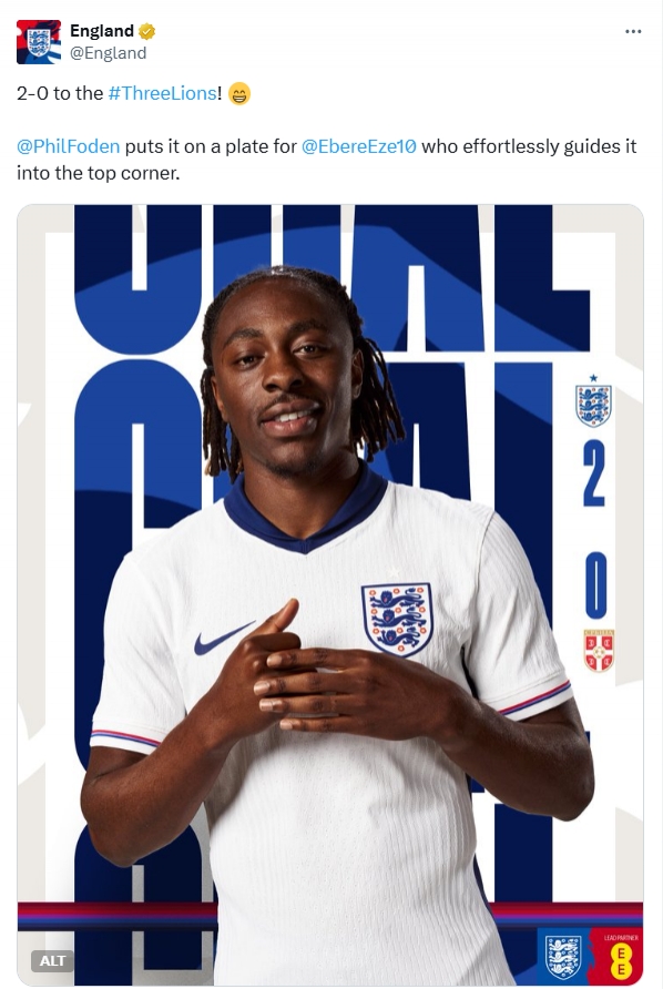 英格兰2-0打败塞尔维亚,埃泽在第90分钟破门锁定胜局,英格兰队官方的进球描写却激发了一众英国球迷的吐槽。