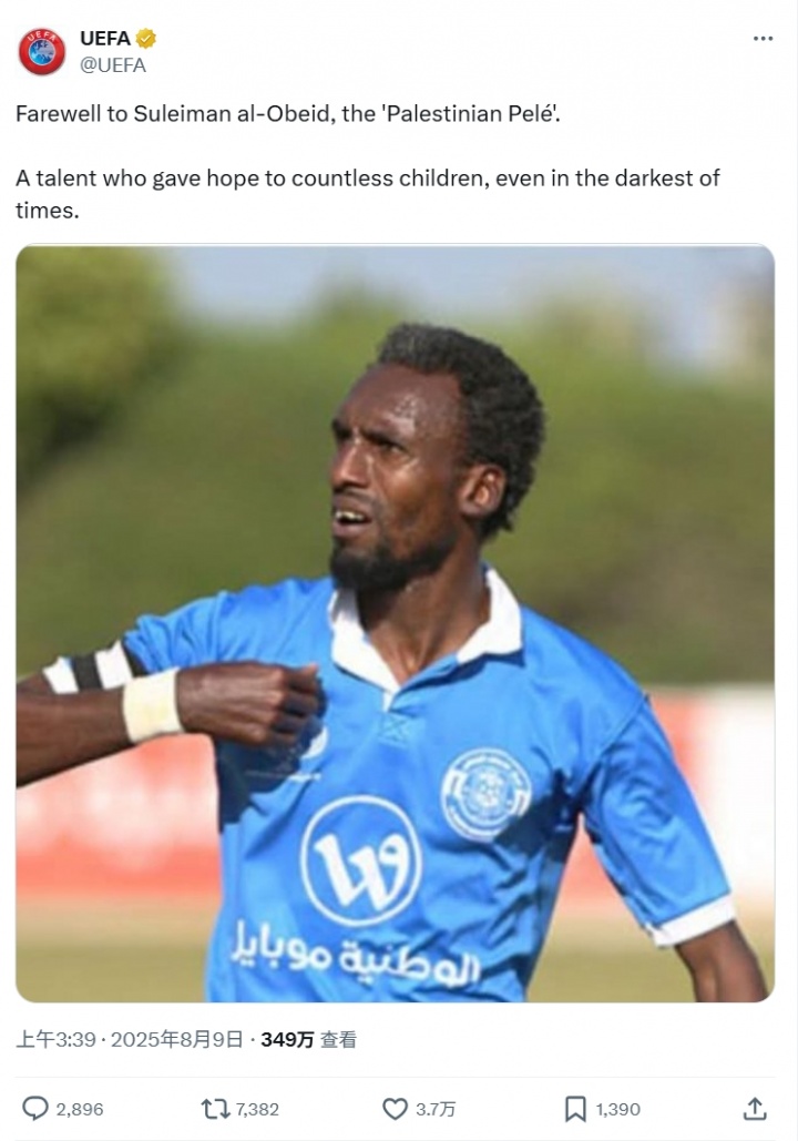 08月09日讯 欧足联官方发布帖文,向死于以色列伏击的巴勒斯坦前国脚奥贝德默哀。