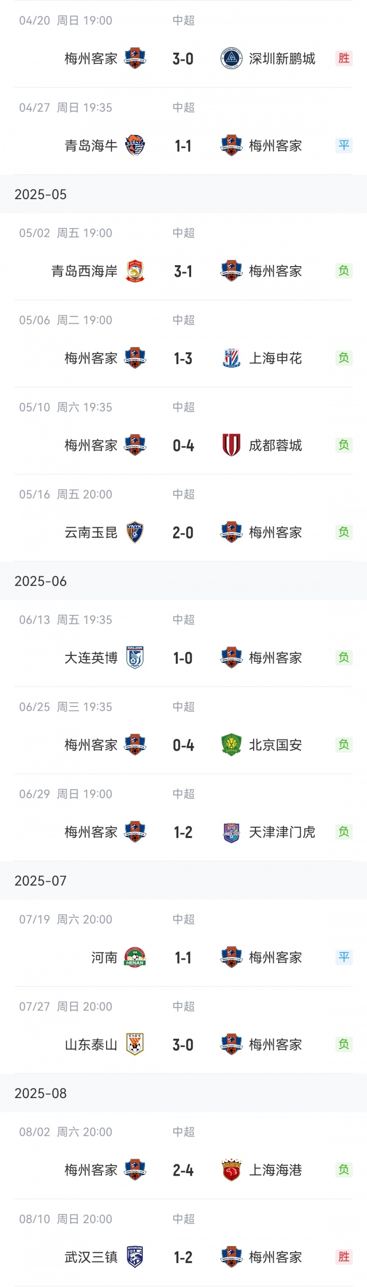 不仅如斯,梅州客家本场得胜散伙了球队近11轮不堪的麻烦。梅州客家上一次赢球还要追忆到4月20日3-0深圳新鹏城的比赛,尔后球队2平9负。