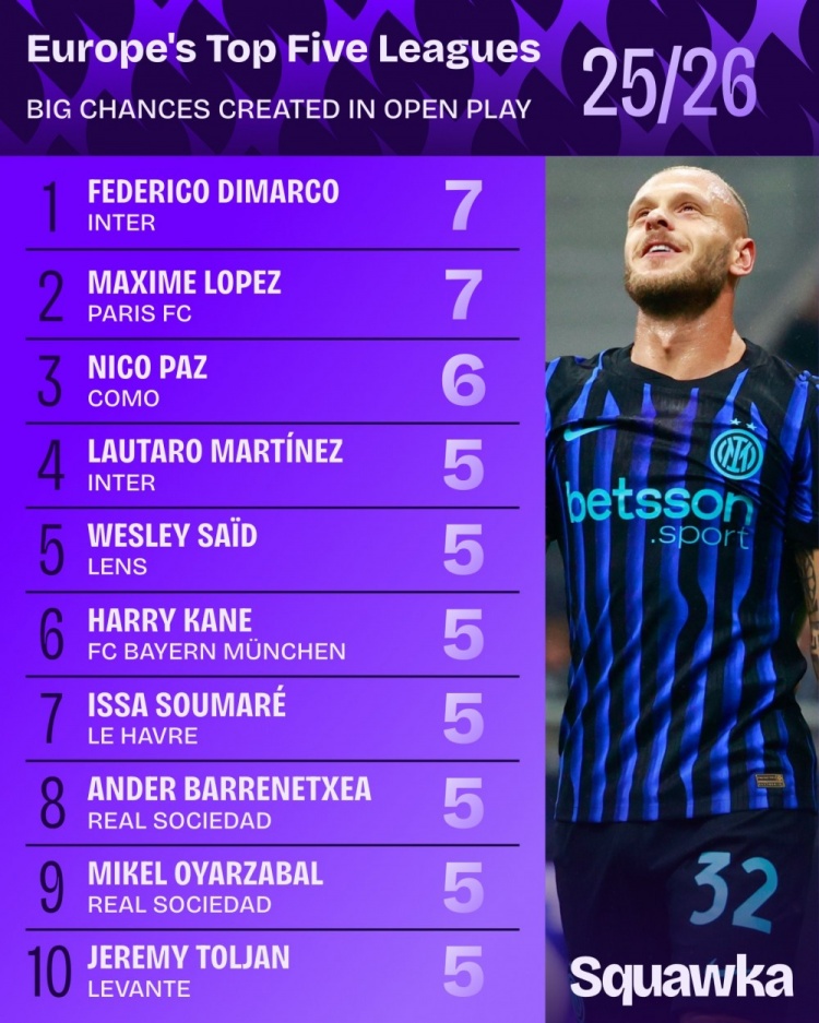 10月9日讯 Squawka统计了球员本赛季在五大联赛结合战中创造要紧契机的次数,并排出榜单,迪马尔科、洛佩斯7次居首,尼科-帕斯6按序三。