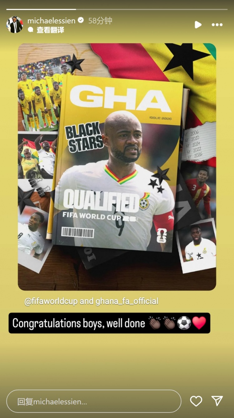 加纳足坛名宿埃辛社媒转发海报,道喜加纳进犯宇宙杯,配文:“恭喜小伙子们,干得好!”