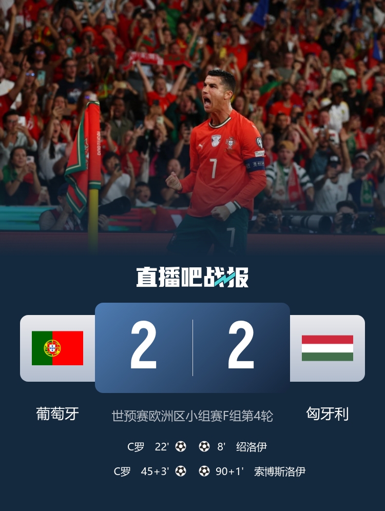 世初赛欧洲区小组赛F组第4轮,葡萄牙2-2匈牙利,无缘本轮晋级天下杯正赛,C罗梅开二度。