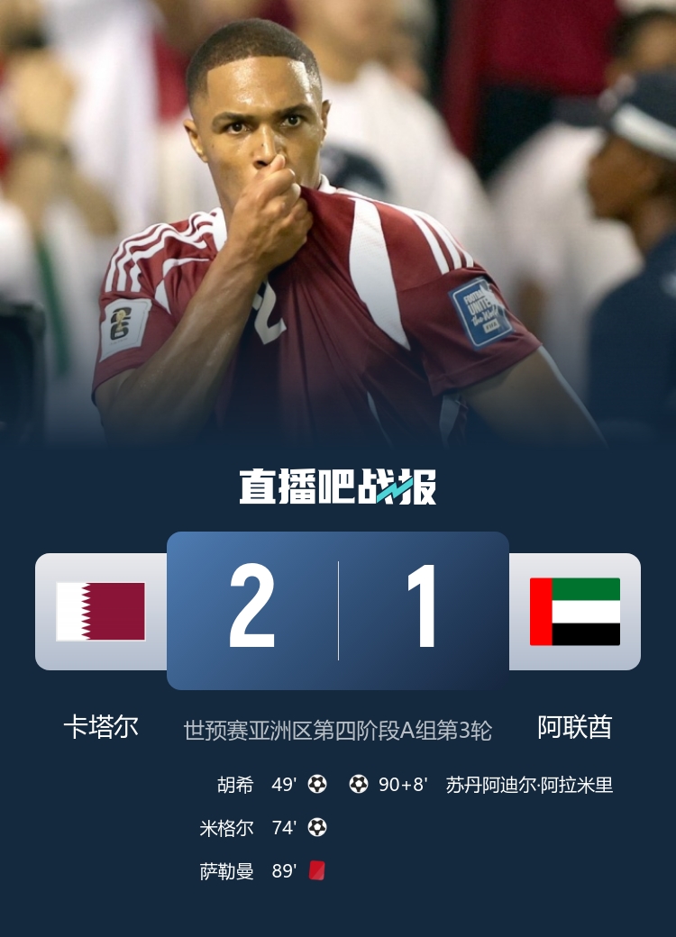 世初赛亚洲区第四阶段A组第3轮,10东说念主卡塔尔2-1投诚阿联酋,晋级2026年天下杯正赛。