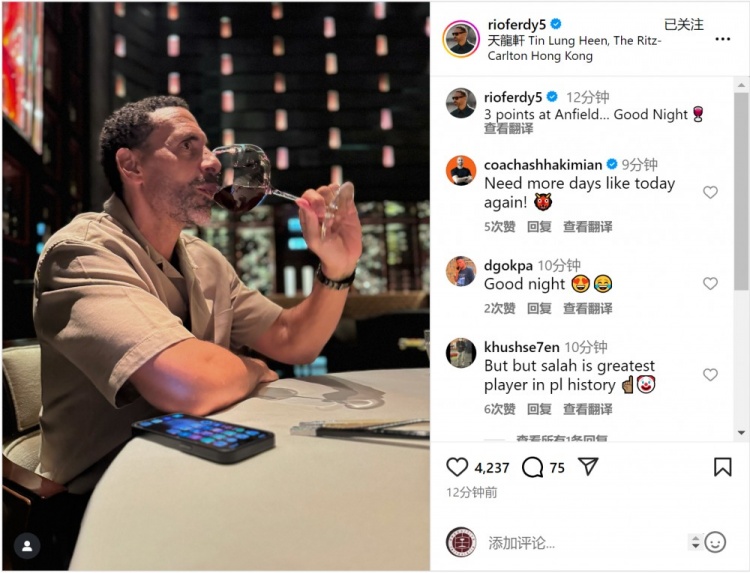 曼联名宿费迪南德社媒晒出喝红酒的相片,庆祝曼联取胜,配文:“在安菲尔德拿到3分,奥密的夜晚。”