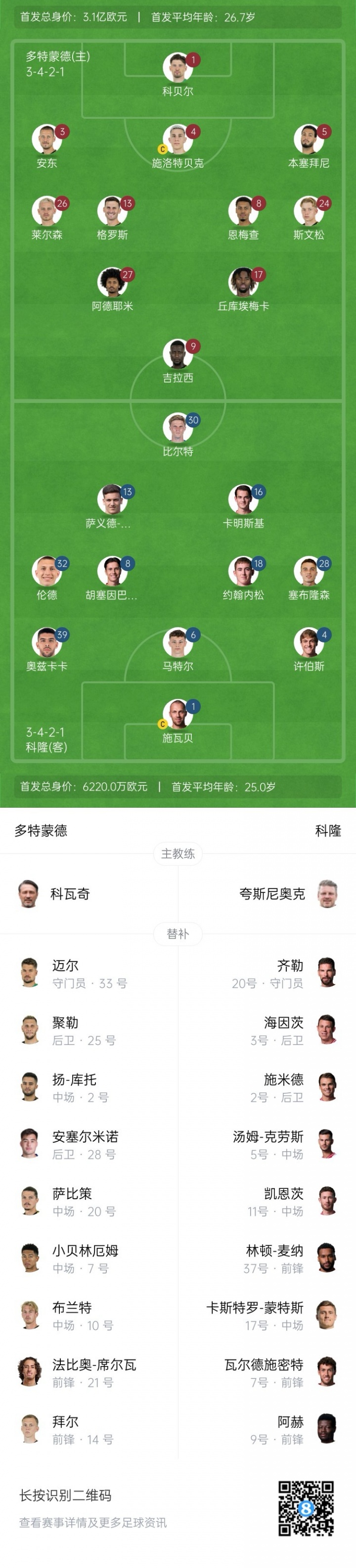 多特首发:1-科贝尔、26-莱尔森、3-安东、4-施洛特贝克、5-本塞拜尼、24-考究松、13-格罗斯、8-恩梅查、27-阿德耶米、17-丘库埃梅卡、9-吉拉西
