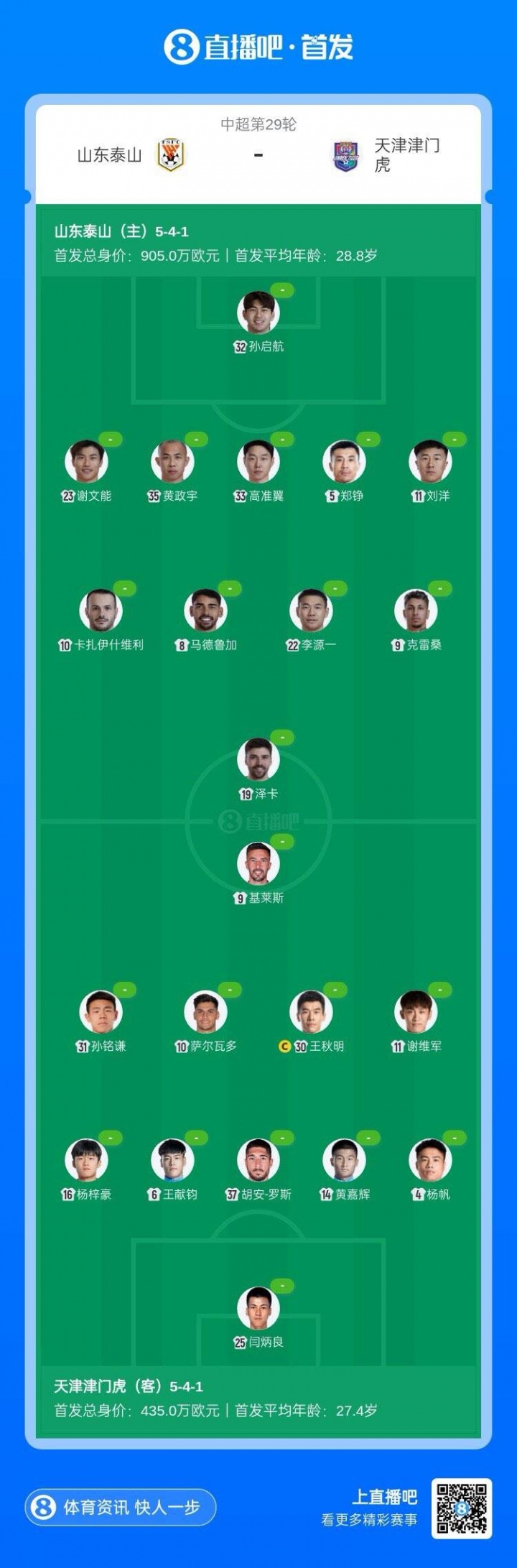 泰山vs津门虎首发:4外助PK3外助,王大雷伤缺,孙动身首秀