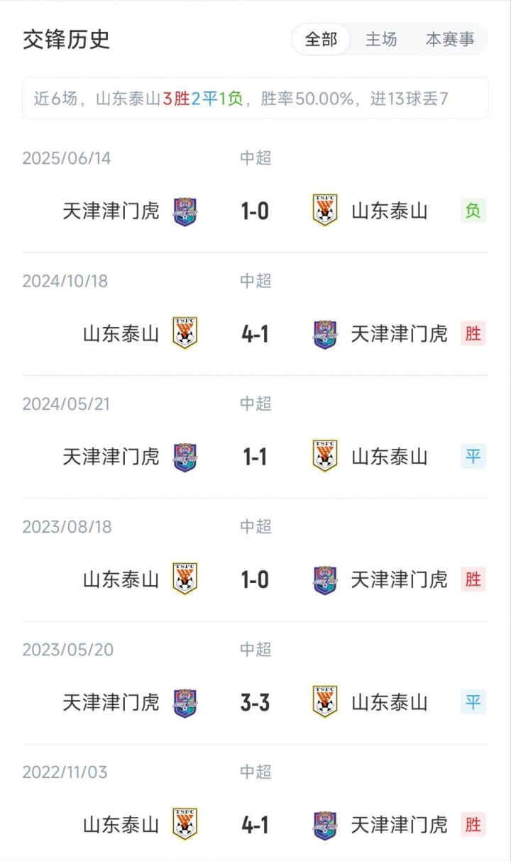 泰山暂列中超第5名,13胜8平7负积47分;津门虎紧随后来排在第6名,12胜8平8负积44分。