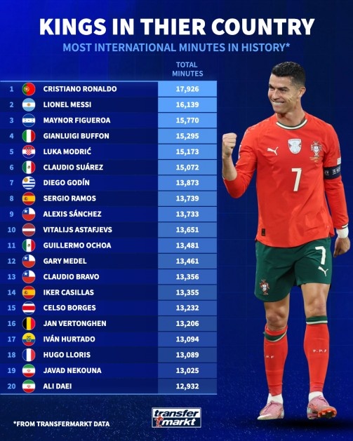 国度队出场时辰名次:C罗、梅西前两名,布冯第四、莫德里奇第五