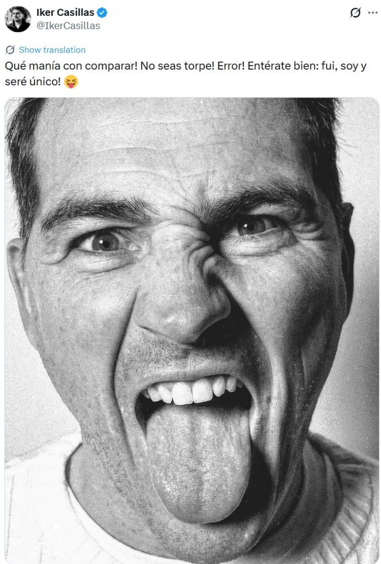 12月1日讯 西班牙名宿卡西利亚斯在社媒晒出一张我方吐舌作念鬼脸的像片,配文写谈:“何须如斯捏着于相比!别傻了!搞了了这少量:我畴昔是、当今是、明天也永远是唯一无二的!”